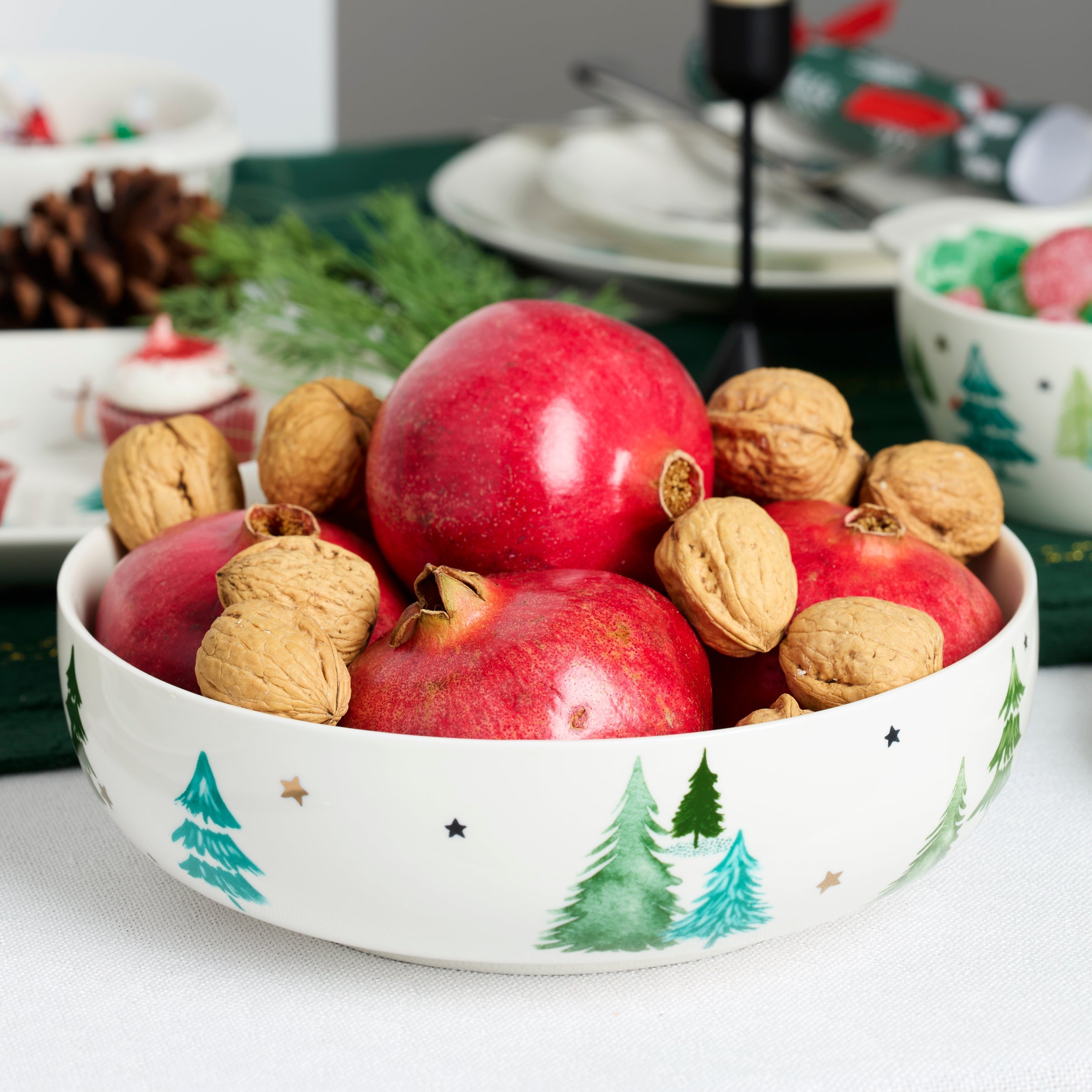 Crafted of porcelain, this serving bowl includes charming evergreen trees and painted metallic stars that shimmer in candlelight. The bowl is part of the Balsam Lane Collection.