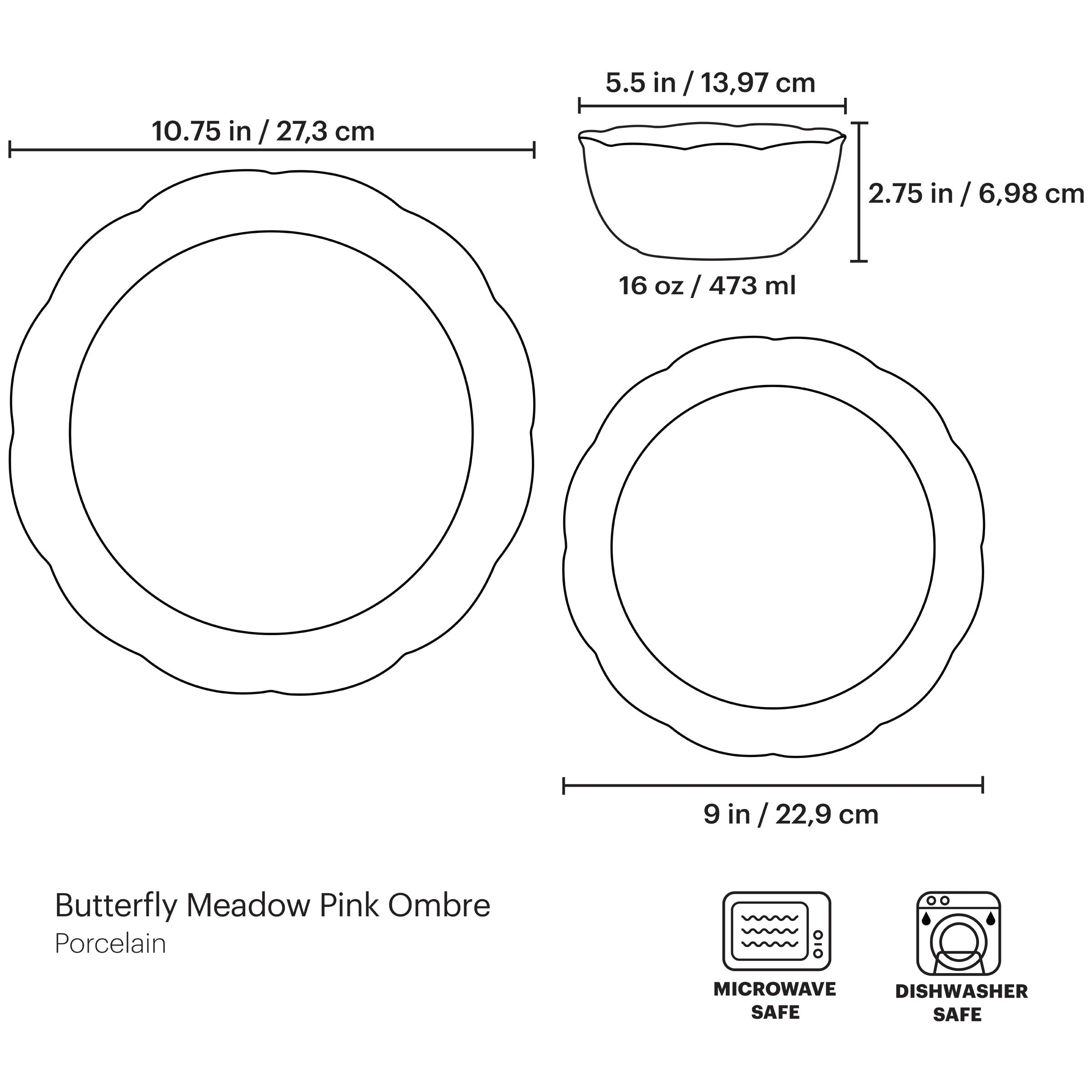 Pretty as a picture-made to mix and match. This fresh addition to our #1 best-selling Butterfly Meadow Collection is as lively and lovely as a picnic-perfect day. Pink Ombre dinnerware preserves snapshots of spring within a blushing border. Dishwasher- and microwave-safe porcelain.