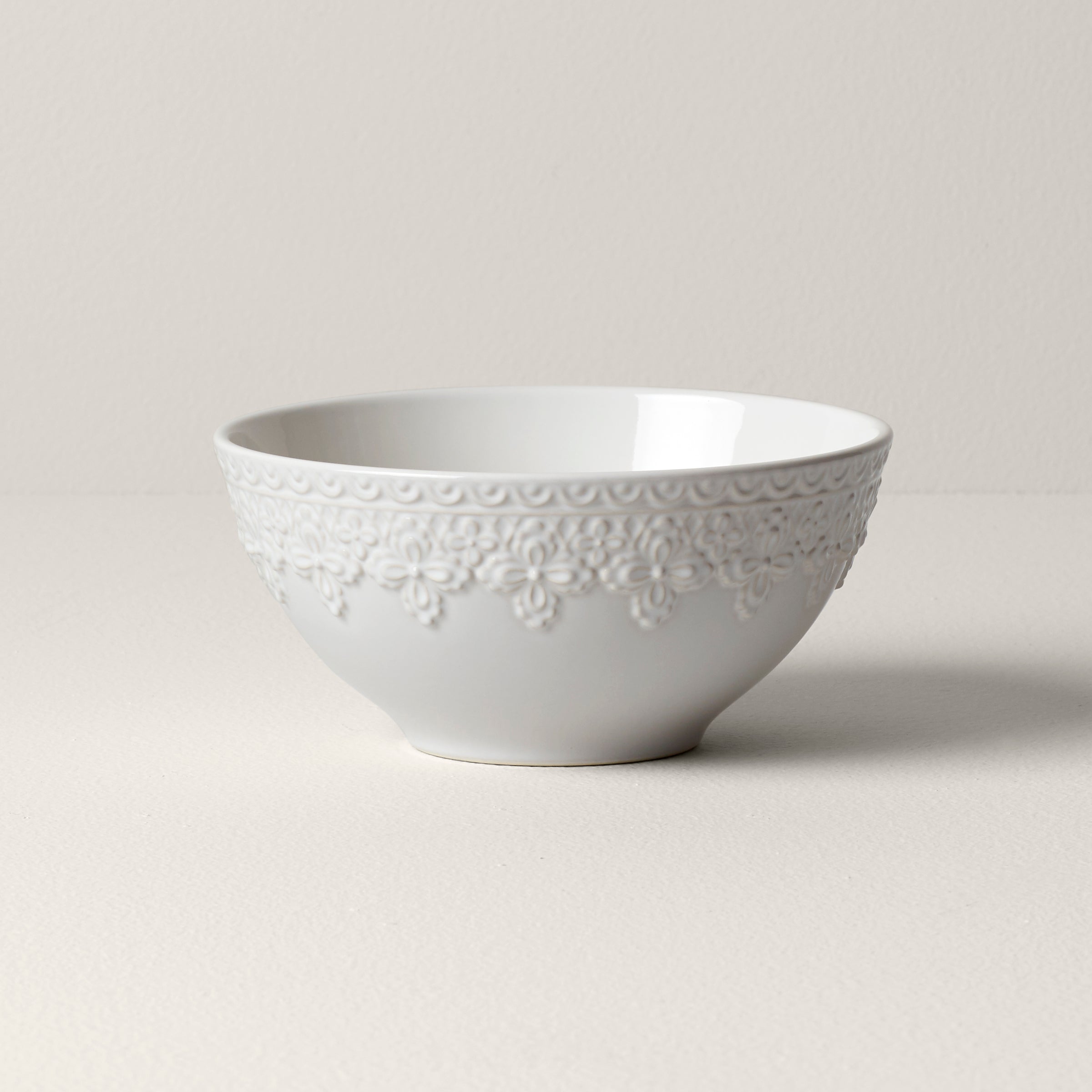 Reminiscent of French matelassé technique, The Chelse Muse Fleur White Accent Plate boasts an intricate quatrefoil pattern carved around its edge with a reactive glaze. This white ironstone dinnerware is dishwasher and microwave-safe.