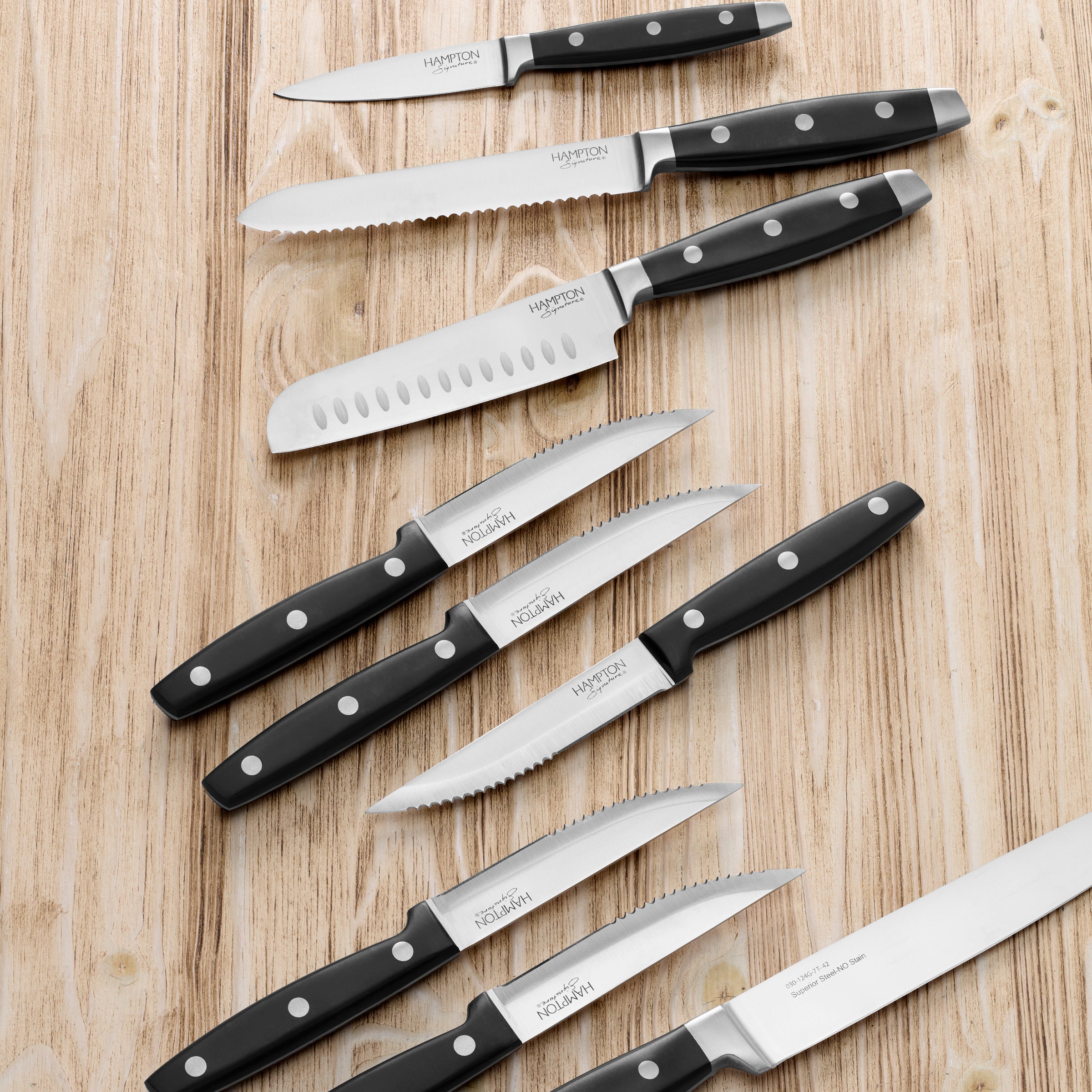 The Continental 15 Piece Cutlery Block Set by Hampton Signature features a classic look complemented with comfortable, ergonomic design. With full-tang, triple-rivet forged blades, generous bolsters, and counterweights, these kitchen essentials are built for lasting performance with a timeless appeal.