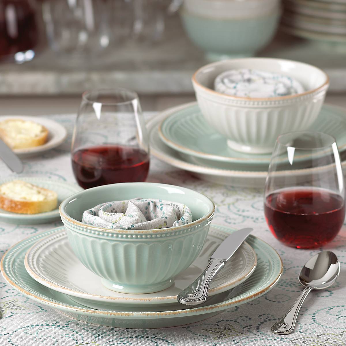 Including a gentle curved border accented with hand-applied tea stains, this four-piece place setting in sky blue features thick grooves and delicate beading for a rustic textured addition to the table. Crafted in durable ceramic stoneware, this item is microwave and dishwasher-safe, for added convenience.