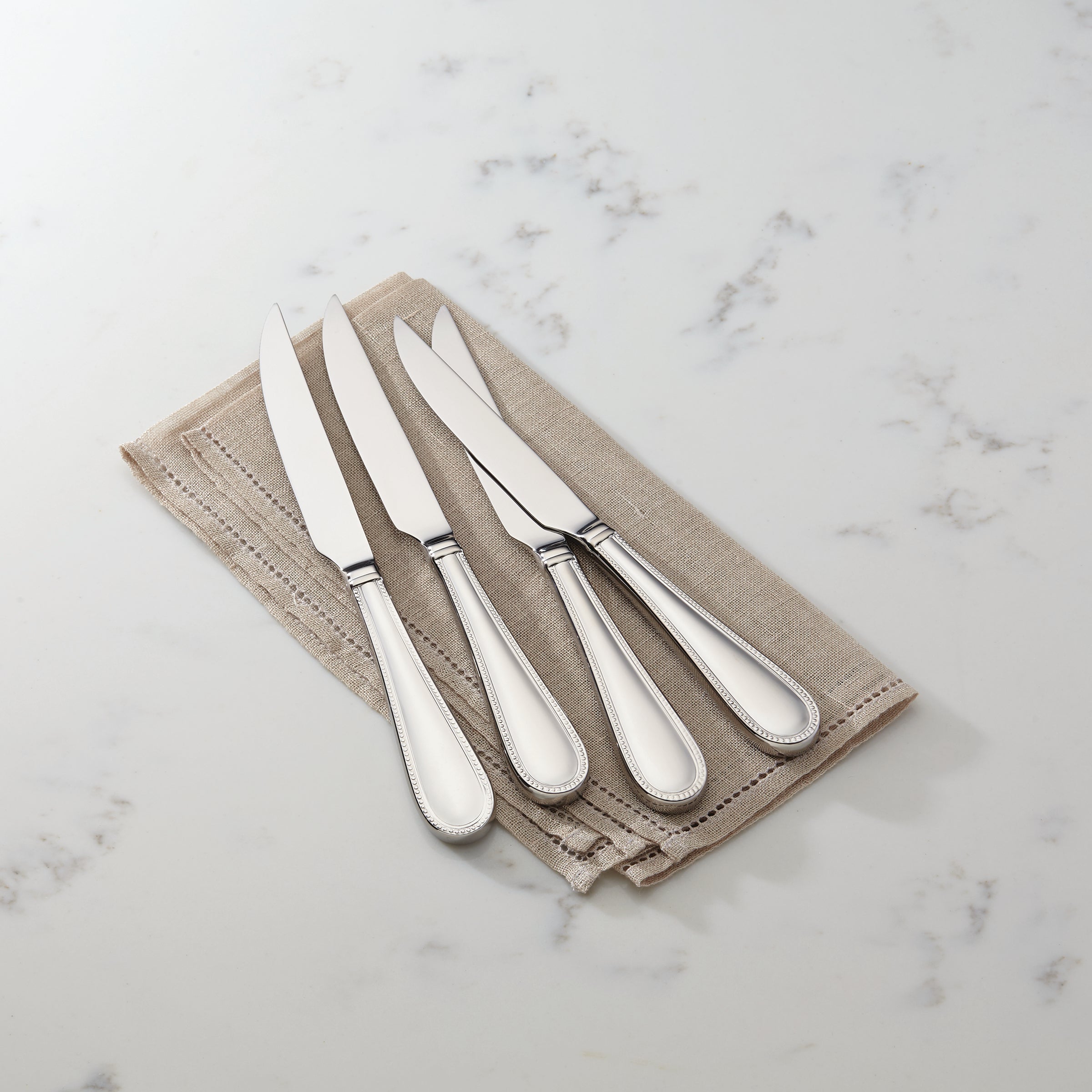 Made of durable stainless steel and part of the the Lyndon Collection, this four-piece steak knife set includes a subtle beaded border on the handle for a hint of texture.