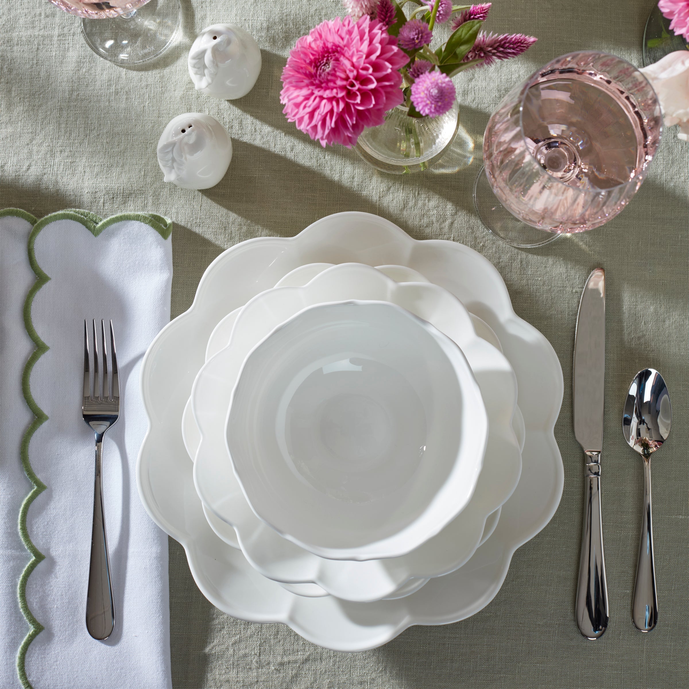 The world is complicated. Setting the table doesn’t have to be. Studio 1414 is refreshingly simple premiere bone china, expertly designed and passionately perfected to be your for-anything, for-forever dinnerware. It’s the essential staple you need and the something special you want, with a bright white glossiness that elevates every occasion. The chic Scallop shape of this 16-piece set complements meals made with love. Dishwasher and microwave safe. Service for 4.